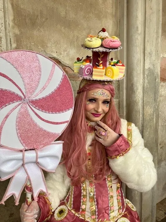 costumes spectaculaires inspirés des confiseries, sucettes, cupcakes et douceurs colorées, volumes généreux, textures brillantes et détails raffinés.
